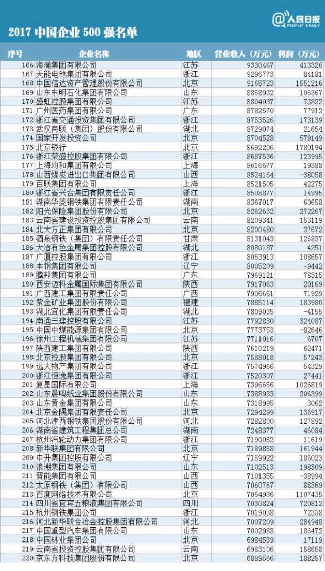 9月10日,中國企業(yè)聯(lián)合會、中國企業(yè)家協(xié)會連續(xù)第16次發(fā)布“中國企業(yè)500強”排行榜。2017中國企業(yè)500強中,國家電網(wǎng)公司、中國石油天然氣集團、中國石油化工集團位列三甲。其中機械化工行業(yè)也是其中的中堅力量,是祖國建設(shè)發(fā)展必不可少的一部分。