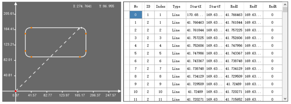 (1)導入DXF文件并解析軌跡數據,精準取得產品曲面輪廓軌跡數據。(2)支持軌跡檢測起點方向設置軌跡分割,快速適應應用場合。(3)支持R角區域樣條軌跡點的插值細分,更精細地進行樣條軌跡運動控制。