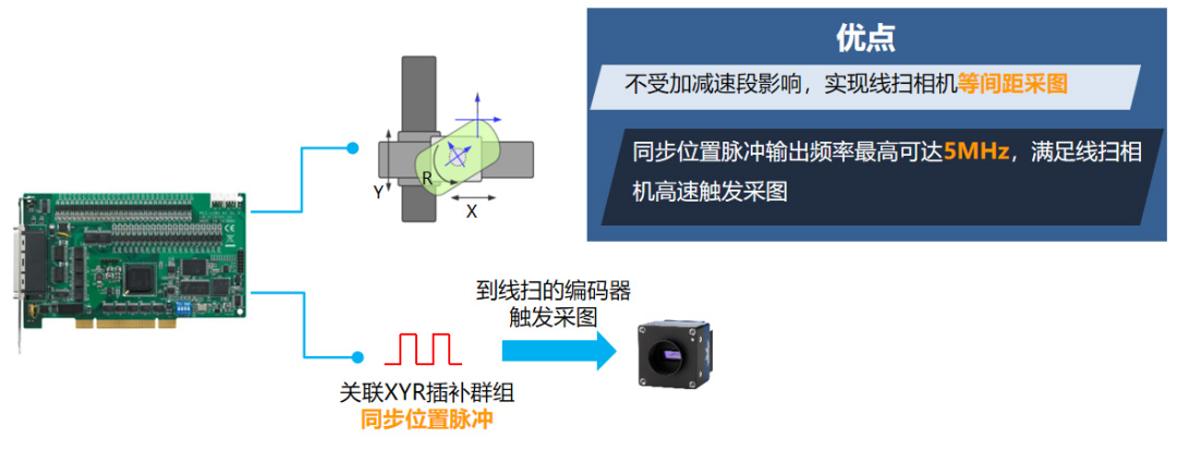 將1個獨立的單軸關聯XYR插補群組,利用同步位置脈沖輸出指令即可使軸輸出與XYR插補群組同步的軌跡位置脈沖到線掃相機的編碼器,觸發線掃相機準確拍照。
