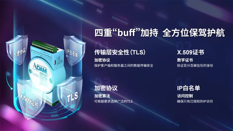 為解決客戶這一顧慮,實現數據的安全和隱私保護,研華Cloud I/O ADAM-6000/6200采取了一系列的安全措施:TLS、X.509證書、加密協(xié)議、IP白名單,筑起數據安全的“防火墻”。
