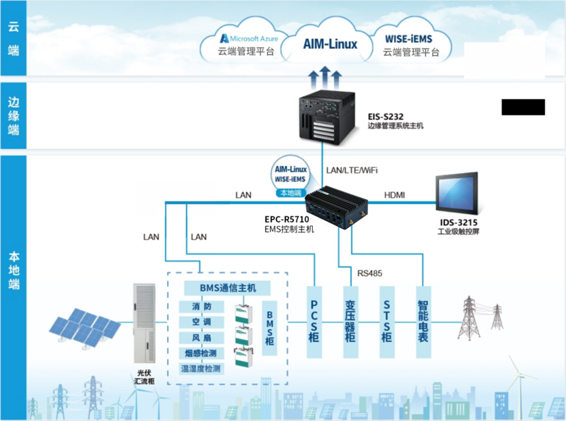 面向上述需求,研華提供貫穿了“端-邊-云”的“軟+硬”完整解決方案。其中,基于NXP I.MX 8M PLUS平臺(tái)EPC-R5710工控機(jī)作為EMS控制器,一方面直接負(fù)責(zé)儲(chǔ)能系統(tǒng)的控制策略,另一方面還監(jiān)控系統(tǒng)運(yùn)行中的故障異常,起到及時(shí)快速保護(hù)設(shè)備、保障安全性的重要作用。