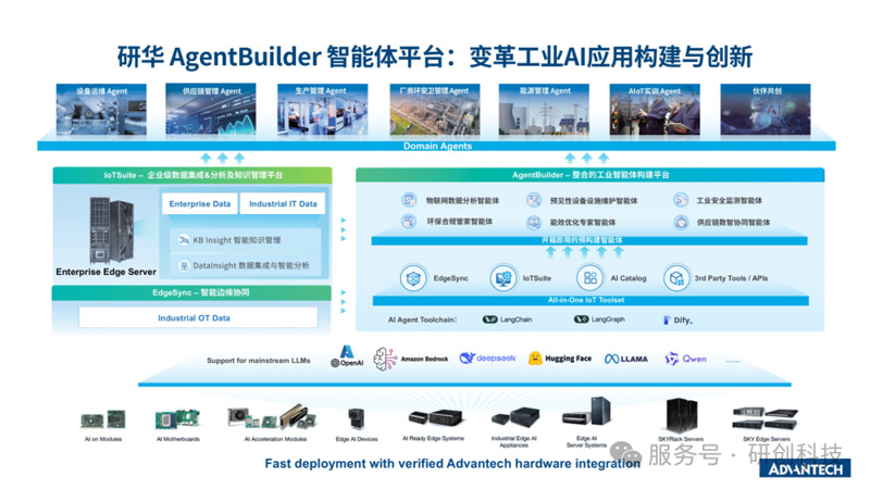 研華在人工智能領域的突破,根植于其在工業物聯網時代積累的海量數據與軟硬件協同能力。蔡總指出,AI價值的釋放需以數據為基礎,而研華通過物聯網硬件向Edge AI的升級,結合自研的AI Agent低代碼開發平臺,構建了軟硬一體的解決方案。該平臺以“快速開發、高效賦能”為核心,幫助設備商、集成商及終端用戶快速落地工業場景的AI應用,例如設備預測性維護、質量檢測優化等。