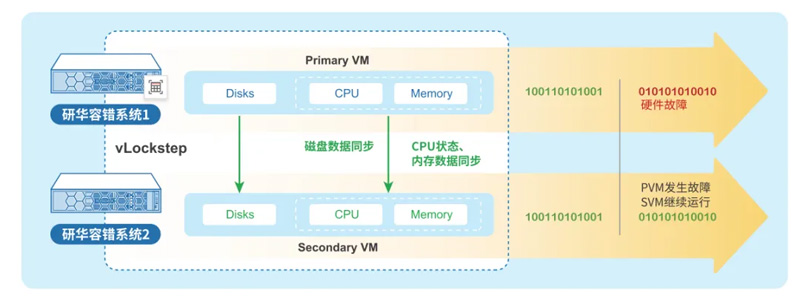 研華容錯系統基于兩組冗余的硬件模組,通過對虛擬機的CPU狀態、內存數據、磁盤數據的實時同步,保障了兄余單元雙活同步運行。當主機節點發生硬件故障時,業務可無縫切換至備機節點,磁盤和內存數據不丟失,業務持續不間斷運行。高可靠工業級平臺確保關鍵數據99.999%安全保護。
