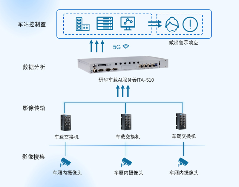 國(guó)內(nèi)某線路地鐵采用研華ITA-510作為其智能化列車的前端分析預(yù)處理單元。通過(guò)安裝在車廂內(nèi)的感知攝像頭,實(shí)時(shí)采集高清圖像視頻數(shù)據(jù),通過(guò)ITA-510強(qiáng)大的AI算力,進(jìn)行前端圖像視頻的預(yù)解碼分析處理,利用計(jì)算機(jī)視覺(jué)技術(shù)和圖像處理算法來(lái)識(shí)別車廂內(nèi)的實(shí)時(shí)擁擠狀況。再將結(jié)果數(shù)據(jù)傳輸?shù)杰囕d服務(wù)器進(jìn)行分布、處理,最后通過(guò)車地的超高速通訊將處理數(shù)據(jù)上傳至云平臺(tái),來(lái)實(shí)現(xiàn)車站客戶端的應(yīng)急聯(lián)動(dòng)和乘客流量引導(dǎo)等精細(xì)化調(diào)度作用。運(yùn)營(yíng)方可以通過(guò)乘客信息系統(tǒng)或者APP對(duì)外發(fā)布,引導(dǎo)乘客有序乘車。同時(shí),該系統(tǒng)也可以對(duì)車上的異常行為做監(jiān)測(cè),比如乘客沖突,安全事故等,可第一時(shí)間報(bào)警或者通知工作人員。智能化的攝像頭充當(dāng)了列車內(nèi)的安全員,可以有效減輕地鐵運(yùn)營(yíng)方的員工作業(yè)強(qiáng)度,降低運(yùn)營(yíng)成本,提升運(yùn)行效率。