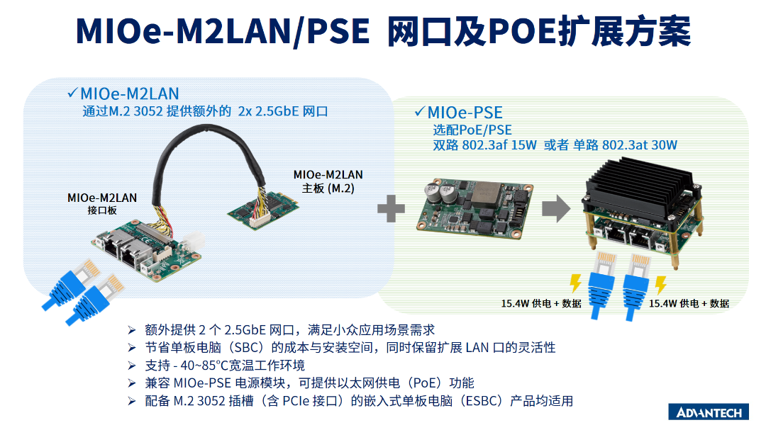 每臺AMR都配備了2D/3D攝像頭,用于同步定位與建圖(SLAM)、路徑規劃和障礙物檢測。這些傳感器主要采用以太網技術,借助其靈活性、軟件可控性以及通過IEEE 1588協議實現的精準時間同步特性開展工作。通過將MIOe-M2LAN和MIOe-PSE?擴展模塊與基于Intel Core Ultra?平臺的AFE-R360單板集成,AMR系統新增了兩個 PoE/PSE局域網輸出端口,簡化了激光雷達和3D立體攝像頭等PoE/PD設備的集成,并在不增加系統體積的同時,加速了AMR的部署。